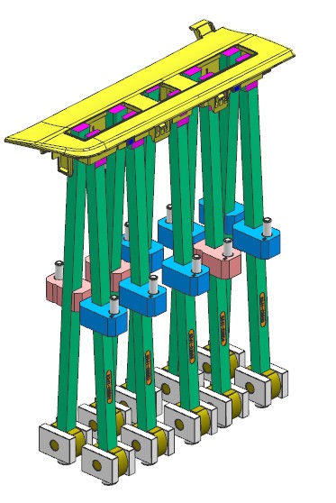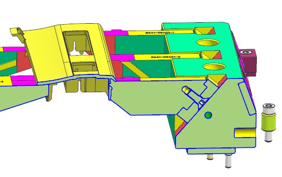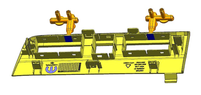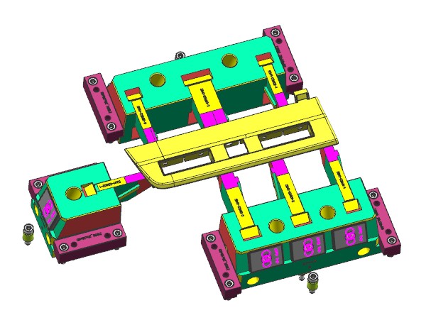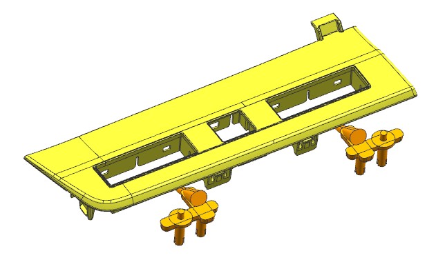 汽车驾驶室装饰盖 。产品有三个方向的卡扣需要滑块抽芯,但卡扣的倾斜角度较大,分别是18度30度和40度,若使用传统的滑块结构,不仅加工困难,运动也有卡死或断裂的风险。本例使用了转角度的设计思路,滑块座水平运动,滑块镶件斜向运动,两者之间用T型槽连接。滑块镶件还需要一个压板承受其Z向载荷,确保它延斜向运动而不是跟随滑块座水平运动。